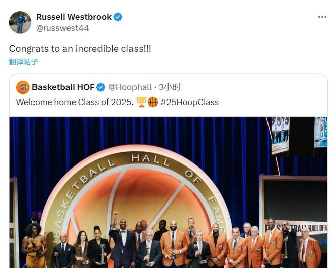威少社媒祝贺2025届名人堂:恭喜他们 了不起的一届!!!
