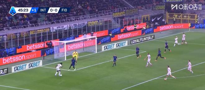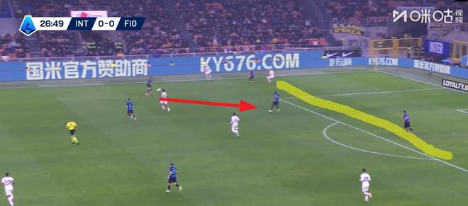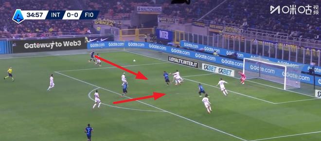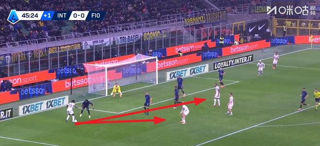 这球可惜之处在于,原本巴斯托尼断球之后可以直接顺势传给前场的劳塔罗,后者处于一个完全真空的进攻位置,但拔丝断球时球弹得离自己太远,追上去再想传时,劳塔罗选择了侧身让出位置而并非继续前插。