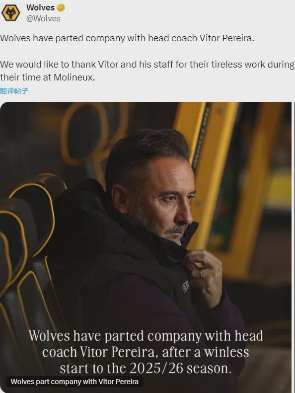 官方:狼队宣布解雇了主帅维托尔-佩雷拉,本赛季他们在10轮联赛过后未尝一胜。